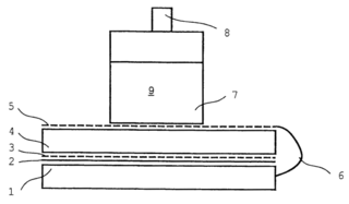 Dorina-Oscillator. 1. Magnetisierbare Grundplatte (Stahl), 2. Isolierschicht, 3. Drahtgeflecht, 4. Quarz-, Glas- oder Keramikplatte, 5. Drahtgeflecht, 6. Leitende Verbindung, 7. Gefäß, 9. Trinkbare Flüssigkeit