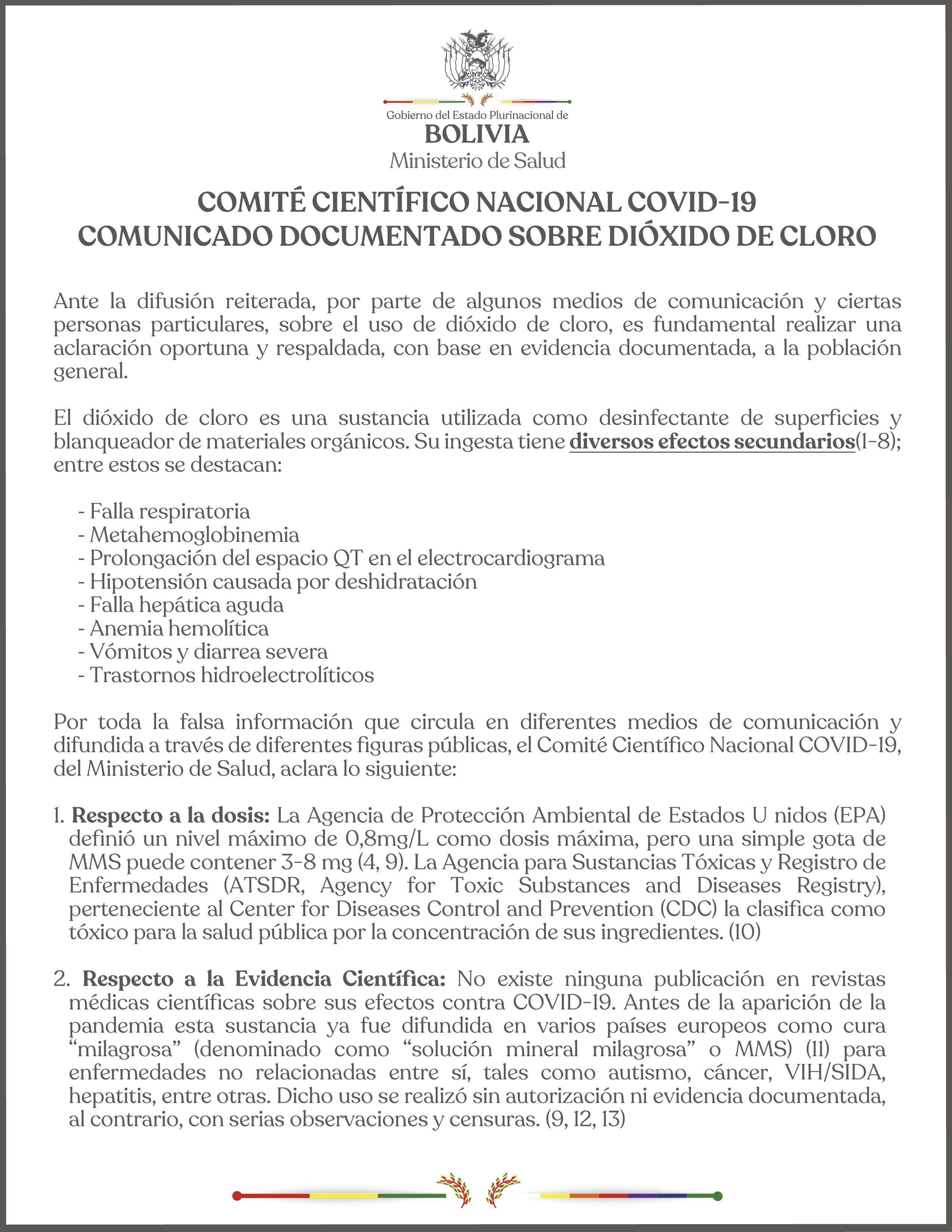 - ↑ https://www.minsalud.gob.bo/4390-ministerio-de-salud-advierte-que-no-hay-base-cientifica-sobre-uso-de-dioxido-de-cloro-contra-covid-19