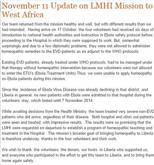 Wie die LMHI am 11. November 2014 auf ihrer Homepage meldete, wurde der Gruppe von vier Homöopathen in Liberia untersagt EVD-Patienten (also Ebolafiebererkrankte) zu sehen. Auch wurde der Gruppe untersagt, am Einsatzort die Homöopathie bei Ebolapatienten einzusetzen. Laut LMHI soll die Gruppe am 7. November 2014 wieder zurückgekehrt sein.[24] Edouard Broussalian spricht jedoch am 24. November 2014 in einem Kurzbericht "Ebola: Petit Compte rendu"[25] nur von einem zehntägigen Aufenthalt in Liberia, von denen er sich drei Tage lang im Gebrauch von Schutzanzügen üben musste. Er müsste demnach am 27. Oktober zurückgekehrt sein.