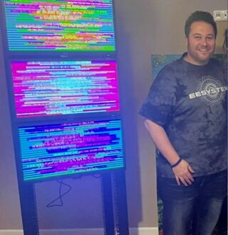Michael Bertolacini, Geschäftsführer der EES LLC, links EES-Bildschirme mit "Skalarwellen"