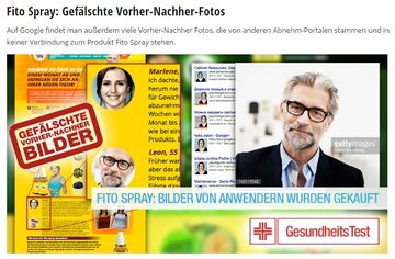 Das Mittel Fito Spray wird im Internet aggressiv beworben. Bei dieser Gelegenheit werden auch so genannte "Vorher-Nachher-Bilder" gezeigt, die jedoch nicht von eigenen Kunden stammen. Bilder von angeblich begeisterten Kunden wurden beispielsweise bei Getty Images gekauft, oder stammen von Vorher-Nachher-Bildreihen von ganz anderen Abnehmprodukten.
