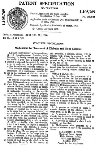 1. Patent GB 1105769, "Medicament for treatment of diabetes and blood diseases ", File Date: Jun 9, 1966. Publication Date: Mar 13, 1968