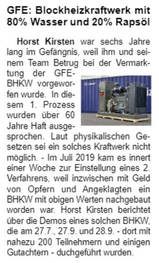 Im Februar 2014 wurde GFE-Gründer Horst Kirsten wegen Betrugs zu neun Jahren Gefängnis verurteilt, Karl Meyer zu fünfeinhalb Jahren. Auch alle anderen elf Angeklagten wurden zu drei- bis sechsjährigen Haftstrafen verurteilt.[12] Nach Auskunft der Staatsanwaltschaft werde gegen über 40 weitere Personen ermittelt. Die Verurteilten waren für schuldig befunden worden, mit ihren nicht funktionierenden Kleinkraftwerken 1.417 Kunden um mehr als 62 Millionen Euro betrogen zu haben.