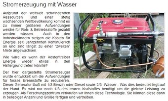 - Wassermotor: Unser Generator läuft mit 1/3 Benzin oder Diesel sowie 2/3 Wasser . Was dies bedeutet liegt auf der Hand. Es wird nur noch 1/3 des teuren Krafstoffes benötigt um die gleiche Leistung zu erzeugen. Als Forschungszentrum verkaufen wir Ihnen diese Technologie. Sie können diese dann in beliebiger Anzahl und Größe fertigen und vertreiben.
