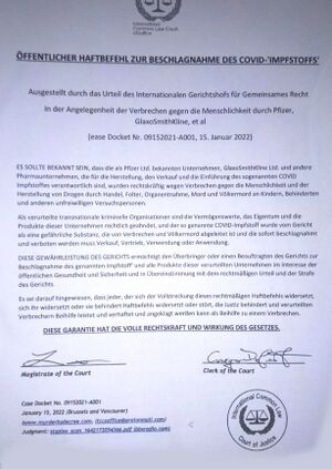 - “After a four-month trial convened under International Law, the judges of the International Common Law Court of Justice (ICLCJ) issued their historic verdict and sentence today, along with Arrest and Expropriation Warrants against the defendants...” ... “The convicted individuals include Albert Bourla and Emma Walmsley, the CEO’s of Pfizer and GlaxoSmithKline Pharmaceuticals, Xi Jinping, President of China, ‘Pope’ Francis (Jorge Bergoglio), ‘Queen’ Elizabeth (Windsor), and Justin Trudeau, Prime Minister of Canada..”