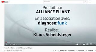 - Gesund aufwachsen in der digitalen Medienwelt, produziert von ELIANT und Diagnose:funk, Regie:Klaus Scheidsteger. Erschienen auch als Buch bei diagnose:media. Autoren: Michaela Glöckler (Anthroposophin und Gründerin von ELIANT, Überzeugungen: Coronapandemie entstand durch die "Schreie der gequälten Tiere" der Massentierhaltung, die wir mit der Luft einatmen, "Kinder bekommen kein Corona", und "Viren sind unsere Freunde"), Edwin Hübner, Stefan Feinauer, Klaus Scheler. Das Video wurde von "Das Goetheanum"[15] beworben. Zitat: Der Film gibt Erziehenden einen kritischen Überblick über den Einfluss von digitalem Medienkonsum auf die frühe menschliche Entwicklung. Regie führte Klaus Scheidsteger, der auch das Drehbuch gemeinsam mit Gertraud Teuchert-Noodt und Peter Hensinger schrieb.[16] und findet sich im Webshop der Anthroposophie-Zeitschrift Info3.
