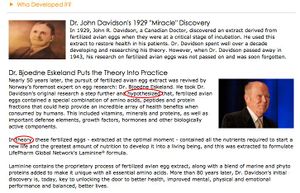 Das ursprüngliche „Wissen“ wird dem kanadischen Arzt Dr. John R. Davidson zugeschrieben, der im Jahre 1929 einen Extrakt aus befruchteten Hühnereiern gewonnen hatte. Und zwar am neunten Tag, als sie in einer "kritischen Phase einer Inkubation" waren. Damit sollten die Selbstheilungskräfte im Patienten aktiviert und die Gesundheit wieder hergestellt werden. Ein Nachweis für irgendeine Wirkung oder die Begründung der Ursache wurde nicht erbracht. Nachdem Dr. Davidson 1943 verstarb, wurde sein Wissen nicht weitergegeben und bald vergessen.