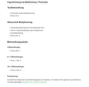 „Das von uns verwendete Lipologieverfahren mit MedContour basiert auf hoch- und niederfrequentem Ultraschall, der über 2 miteinander korrespondierende Ultraschallköpfe gezielt auf das Fettgewebe abgegeben wird. Ultraschall kann Fettzellen zerstören. Ausgeflossenes Fett und Zellfragmente werden unterstützt durch eine Lymphdrainage nach jeder Behandlung über die Lymphe zu den Organen getragen und verstoffwechselt“ [10]