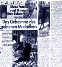 Maria Duval (Eigenbezeichnung “die größte Hellseherin der Welt“) ist das Pseudonym von Carolina Maria Gambia (geb. 1938 in Mailand). Unter dem Namen Maria Duval (“Clairvoyant of Paris”) und mit einem seit Jahrzehnten ähnlichen Konterfei versehen werden in verschiedenen Ländern in offenbar betrügerischer Absicht Rundsendungen verschickt. Vorgeblich persönliche Anschreiben benachrichtigen die Empfänger über angeblich hellseherisch erkannte, bevorstehende Ereignisse (zum Beispiel Lotteriegewinne).[1] Wer auf die Briefe reagiert, erhält Rechnungen oder Nachnahmesendungen, die bei Empfang bezahlt werden müssen. Auch werden Gutscheine versandt, die mit Angaben zur eigenen Person ausgefüllt zurückgesandt werden sollen. Rücksender erhalten anschließend viel Werbung für Produkte des Esoterikmarkts (v.a. astrologische Angebote). Die auf diese unlautere Weise gewonnenen Adressdaten werden weiterverkauft. Wer Anschreiben beantwortet, muss mit noch mehr Post von Versicherungen, Lotterien, Esoterikshops oder Hellsehern rechnen.[2] Von dieser Aktion zur Sammlung von Adressdaten profitierten bislang: