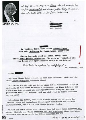 Ein typischer "Maria Duval"-Brief, hier in deutscher Sprache. Laut diesem Brief halte sie sich gerade in China auf.