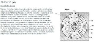 - EP 1770715 A1: "Micro plasma reactor". Anmeldedatum: 4.4.2007. Kurzfassung: "A fixed or handheld micro-plasma-reactor can be build-in, connected with and/or inserted into various electrical/electronic devices (i.e. mobile phones, computers), in various objects (i.e. lighting devices in general, light bulb, microchips, IC's), in various container types (i.e. cooking pan) and all type of machines, i.e. vacuum-cleaner, pumps, electrical car, etc., to generate DC current and/or AC, and consequently the various uses resulting from electrical current, for lighting, for heating/cooling, and desired process (i.e. creation magnetic fields). The self-sustaining plasmatic process gives independent functioning without connections to any electrical power network, solar cells or the need to recharge. New type of products will be created. Different type of micro-reactors are decribed, and new methodes of technology."