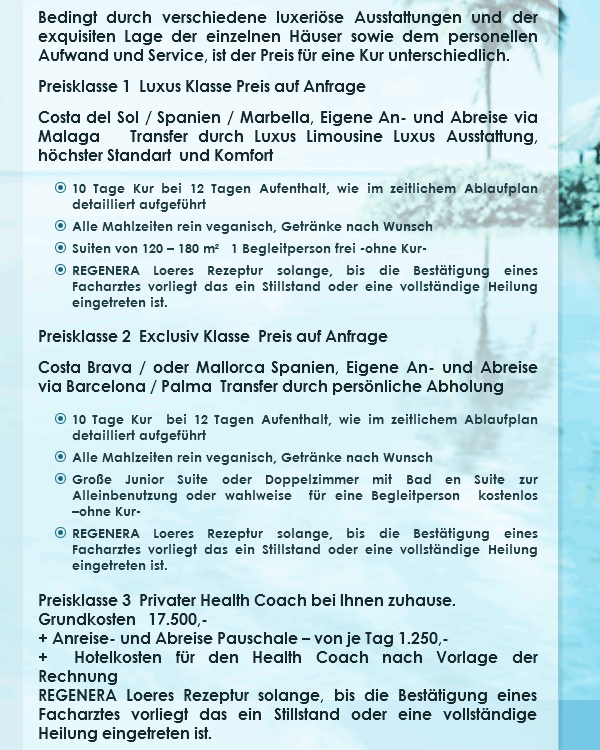 Für die billigste Variante, die Einnahme des Präparats zuhause statt in einem REGENERA Haus, wurde 2013 ein Preis von 17.500 Euro genannt, zuzüglich erheblicher Reisespesen für einen "Health Coach".[16] Anfang 2014 war von einem "Grundpreis" von 1.750 Euro die Rede (siehe Bild rechts). Die weiteren Kosten seien "variabel, aber begrenzt auf/bis höchstens € 12.500,- für die gesamte Kur & Therapie."