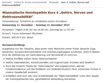 Kurs 4 aus der Reihe "Miasmatische Homöopathie", im Jahr 2014 mit dem Titel "Gehirn, Nerven und Elektrosensibilität"