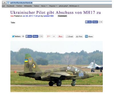 - "Andererseits, ein ukrainischer Flieger, der Pilot eines Kampfflugzeuges Su-25, hat in einem Interview mit der deutschen Zeitung “Wahrheit für Deutschland” die Verantwortung für die Vernichtung des Passagierflugzeuges von Malaysia Airlines am 17. Juli im Osten der Ukraine übernommen. (Anmerkung ML: Die Quelle dieses Artikels, soll eine Satireseite sein! Trotzdem ist der Abschuss mit Bordkanonen nicht so einfach von der Hand zu weisen – siehe Artikel hier)."