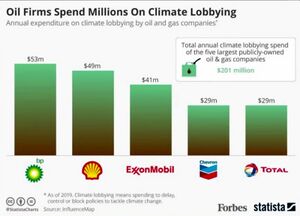 Mineralölkonzerne, Steinkohleindustrie und verwandte Wirtschaftszweige und insbesondere der US-amerikanische Konzern ExxonMobil finanzieren PR-Firmen, bestimmte "Institute" und Einzelpersonen zum Zweck der Beeinflussung der öffentlichen Meinung zum Thema Global Climate Change (GCC).[24][25][26][27][28][29][30] Die finanzielle Unterstützung erfolgt auch nachträglich, wie im Fall von Personen aus dem "environment" der ehemaligen Bush-Regierung.[31] ExxonMobil gibt dies selbst auch zu.[32][33][34]
