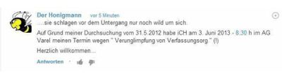 - Ein Imker im fortgeschrittenen Alter postet sich unter dem Pseudonym “Der Honigmann” seit noch nicht allzu langer Zeit auf seinem Blog um Kopf und Kragen. Abmahnbares in Serie: Unerlaubtes Übernehmen ganzer Artikel aus großen Online-Zeitungen, ein völlig unzureichendes Impressum, ein Online-Shop wo fast nichts den rechtlichen Vorgaben entspricht, vermutlich strafbare Holocaust-Postings und en masse zweifelhafte Fremdbeiträge samt tausenden rechtlich fragwürdigen Leserkommentaren.