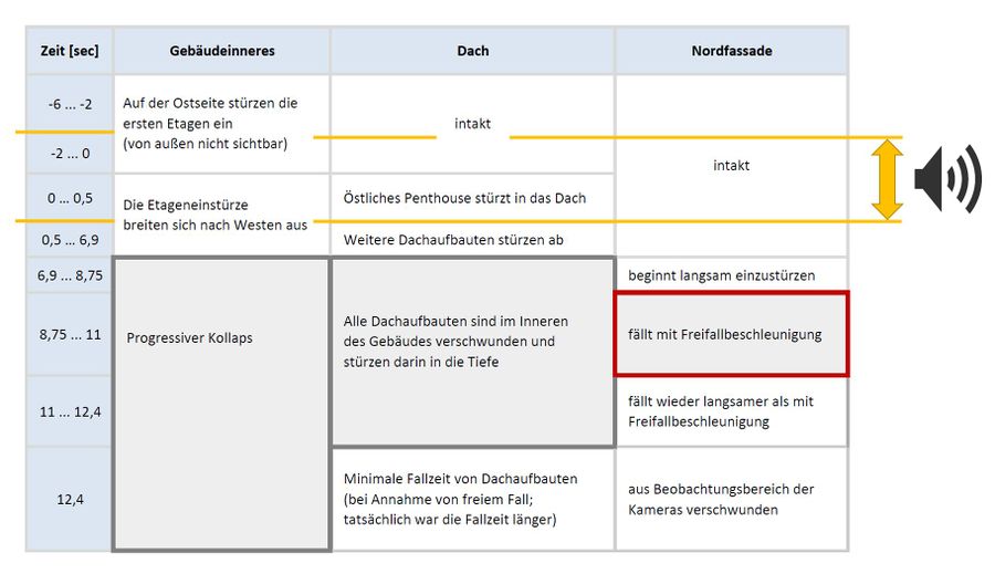 Der tatsächliche Beginn des Einsturzvorgangs liegt noch früher, als diese Videoaufnahme vermuten lässt; er konnte anhand seismischer Aufzeichnungen und Analysen horizontaler Bewegungen des Gebäudes auf ca. 13 Sekunden vor dem Einsturz der Nordfassade datiert werden; siehe dazu die folgende Übersicht: | Der tatsächliche Beginn des Einsturzvorgangs liegt noch früher, als diese Videoaufnahme vermuten lässt; er konnte anhand seismischer Aufzeichnungen und Analysen horizontaler Bewegungen des Gebäudes auf ca. 13 Sekunden vor dem Einsturz der Nordfassade datiert werden; siehe dazu die folgende Übersicht: | ||