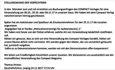 Der Compact Magazin Verlag hatte im Sommer 2017 vergeblich versucht Räume im Leipziger Eventpalast in der Puschstraße (Alte Messe) für Ende Oktober und Anfang November zu mieten. Später ging dann eine Anfrage ein mit dem Terminwunsch 25. November 2017. Der Mieter stellte sich als Auktionator und Spediteur vor, sprach von einem geplanten „Motivationstraining für Auktionatoren“ und erhielt den Termin.<ref>https://www.l-iz.de/politik/engagement/2017/11/NoCompact-im-Eventpalast-Vermieter-spricht-von-vorsaetzlicher-Taeuschung-198518</ref> Tatsächlich handete es sich aber um eine "Souveränitätskonferenz " des Compact Verlags. Es sollen als Vortragsredner mehrere Rechtsextremisten und -populisten als Vortragsredner der Veranstaltung "Opposition heißt Widerstand" auftreten. Genannt werden Björn Höcke (AfD), Lutz Bachmann (Pegida) und Martin Sellner (Identitäre). Als weitere Redner sind der AfD-Bundestagsabgeordnete Martin Reichardt Oliver Hilburger angekündigt, letzter Gründungsmitglied der Rechtsrockband „Noie Werte“, deren Musik als „Soundtrack“ für das erste Bekennervideo des NSU diente. Moderatorin ist Leyla Bilge, eine Mitarbeiterin des AfD-Bundestagsabgeordneten Ulrich Öhme, der zuvor Schriftführer der islamgegnerischen Partei "Die Freiheit" war.<br>Als die Polizei den Eventpalast Leipzig über eine geplante "Compact Konferenz" informierte, gab der Vermieter bekannt, gerichtlich gegen den Compact Verlag vorgehen zu wollen, da er sich getäuscht fühlte: ''.. „Hätten wir gewusst, dass es sich um eine Veranstaltung des Compact-Verlages handelt, hätten wir unsere Räume definitiv nicht vermietet..“'' Der Compact-Verlag hielt den genauen Ort des geplanten Compact Konferenz geheim, und gab diesen erst am 24. November bekannt. Zuvor hatte sich in Leipzig bereits ein Aktionsbündnis #NoCompact gegen die Konferenz gebildet.<ref>http://www.lvz.de/Leipzig/Lokales/Vor-Compact-Konfernez-Leipziger-Eventpalast-will-gegen-Mieter-vorgehen</ref> Wie die Dresdner Neuen Nachrichten am 25. November 2017 meldeten, wurde der Leipziger Eventpalast von der Polizei hermetisch mit Metallzäunen abgeriegelt. Zwei Wasserwerfer und ein Räumpanzer wurden mit vier Hundertschaften Polizei aufgefahren um die Veranstaltung zu schützen. Pressevertreter durften den Saal nicht betreten, Besucher mussten durch eine Personenkontrolle, möglicher Weise wollen die Veranstalter damit unerwünschte Videomitschnitte verhindern.<ref>http://www.dnn.de/Mitteldeutschland/News/Proteste-gegen-Compact-Konferenz-in-Leipzig</ref><br> | Der Compact Magazin Verlag hatte im Sommer 2017 vergeblich versucht Räume im Leipziger Eventpalast in der Puschstraße (Alte Messe) für Ende Oktober und Anfang November zu mieten. Später ging dann eine Anfrage ein mit dem Terminwunsch 25. November 2017. Der Mieter stellte sich als Auktionator und Spediteur vor, sprach von einem geplanten „Motivationstraining für Auktionatoren“ und erhielt den Termin.<ref>https://www.l-iz.de/politik/engagement/2017/11/NoCompact-im-Eventpalast-Vermieter-spricht-von-vorsaetzlicher-Taeuschung-198518</ref> Tatsächlich handete es sich aber um eine "Souveränitätskonferenz " des Compact Verlags. Es sollen als Vortragsredner mehrere Rechtsextremisten und -populisten als Vortragsredner der Veranstaltung "Opposition heißt Widerstand" auftreten. Genannt werden Björn Höcke (AfD), Lutz Bachmann (Pegida) und Martin Sellner (Identitäre). Als weitere Redner sind der AfD-Bundestagsabgeordnete Martin Reichardt Oliver Hilburger angekündigt, letzter Gründungsmitglied der Rechtsrockband „Noie Werte“, deren Musik als „Soundtrack“ für das erste Bekennervideo des NSU diente. Moderatorin ist Leyla Bilge, eine Mitarbeiterin des AfD-Bundestagsabgeordneten Ulrich Öhme, der zuvor Schriftführer der islamgegnerischen Partei "Die Freiheit" war.<br>Als die Polizei den Eventpalast Leipzig über eine geplante "Compact Konferenz" informierte, gab der Vermieter bekannt, gerichtlich gegen den Compact Verlag vorgehen zu wollen, da er sich getäuscht fühlte: ''.. „Hätten wir gewusst, dass es sich um eine Veranstaltung des Compact-Verlages handelt, hätten wir unsere Räume definitiv nicht vermietet..“'' Der Compact-Verlag hielt den genauen Ort des geplanten Compact Konferenz geheim, und gab diesen erst am 24. November bekannt. Zuvor hatte sich in Leipzig bereits ein Aktionsbündnis #NoCompact gegen die Konferenz gebildet.<ref>http://www.lvz.de/Leipzig/Lokales/Vor-Compact-Konfernez-Leipziger-Eventpalast-will-gegen-Mieter-vorgehen</ref> Wie die Dresdner Neuen Nachrichten am 25. November 2017 meldeten, wurde der Leipziger Eventpalast von der Polizei hermetisch mit Metallzäunen abgeriegelt. Zwei Wasserwerfer und ein Räumpanzer wurden mit vier Hundertschaften Polizei aufgefahren um die Veranstaltung zu schützen. Pressevertreter durften den Saal nicht betreten, Besucher mussten durch eine Personenkontrolle, möglicher Weise wollen die Veranstalter damit unerwünschte Videomitschnitte verhindern.<ref>http://www.dnn.de/Mitteldeutschland/News/Proteste-gegen-Compact-Konferenz-in-Leipzig</ref><br> | ||
