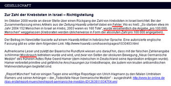 - Krebsmortalität in Israel: am 6. Juli 2009 ließ Hamer einen offenen Brief an Freunde - Krebstote in Israel verbreiteten, in dem er die Zahl der Krebstoten in Israel kommentierte. Laut eigenen Ansichten würde ja dort seine Neue Medizin angewendet werden. Er bezog sich dabei auf einen Zeitungsartikel in Haaretz,[37] der in einem Newsletter der israelischen Botschaft zitiert wurde. Hamer schrieb: [...] So starben - laut Newsletter der Botschaft - im Jahr 2004 in Israel 152 Menschen an Krebs, und im Jahr 2003 wären es noch 160 Tote gewesen (Anm. bei ca. 6,2 Mio Einwohnern). In Österreich z.B. starben 2008 demgegenüber 19.785 Menschen (bei 8,3 Mio Einwohnern). Und in Deutschland sterben täglich qualvoll 1.500. Natürlich kann man davon ausgehen, daß das auch für alle Juden außerhalb von Israel gilt, d.h. praktisch kein jüdischer Patient stirbt mehr an Krebs. Dagegen sterben die nicht-jüdischen Patienten weltweit zu 98% an Chemo und Morphium. Deshalb findet man auch keine jüdische Chemoleiche. [...] Doch nun haben die Juden quasi selbst das Lügenkartenhaus zum Einsturz gebracht. [...] Israel selbst hat uns praktisch den Beweis dafür geliefert, daß es niemals in der Geschichte der Menschheit eine Gruppe / Religionsgemeinschaft oder mafiöse Vereinigung von derartiger globaler Menschenverachtung, krimineller Energie und Grausamkeit, allen nichtjüdischen Menschen gegenüber, gegeben hat. Jedem ehrlichen Menschen muß das Blut in den Adern gefrieren, angesichts der weltweit Millionen (Milliarden?) Toten. Hierbei übersah aber der ehemalige Arzt Hamer, dass über die international standardisierte Mortalitätsrate (bezogen auf 100.000 Einwohner und Jahr) berichtet wurde und dass es sich nicht um die absoluten Zahlen handelte, so wie sie auf den Webseiten des israelischen Gesundheitsministerium einsehbar sind.[38] Hamer benutzt also hier seine eigene grob fehlerhafte Interpretation zu antisemitischer Hetze.