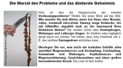 Eine international auftretende undurchsichtige Firma namens DrNatura bietet in verschiedenen Sprachen im Internet diverse Produkte an, die einer so genannten Darmreinigung dienen sollen. DrNatura versucht Profit aus Befürchtungen von Darmhypochondern und leichtgläubigen Laien um eine unregelmässige Verdauungstätigkeit, Reizdarmsymptomen, möglichen Darmparasiten und Darmkrebs zu erlangen, und verbreitet dazu laienhafte Horrormeldungen und schockierend aussehende Bilder. Ziel ist es die eigene teure Produktlinie zu verkaufen. Dazu sollen auch unüberprüfbare Anekdoten angeblicher ausschliesslich glücklicher Kunden sowie von [[Alternativmedizin]]ern eines obskuren ''Global College of Natural Medicine'' dienen. | Eine international auftretende undurchsichtige Firma namens DrNatura bietet in verschiedenen Sprachen im Internet diverse Produkte an, die einer so genannten Darmreinigung dienen sollen. DrNatura versucht Profit aus Befürchtungen von Darmhypochondern und leichtgläubigen Laien um eine unregelmässige Verdauungstätigkeit, Reizdarmsymptomen, möglichen Darmparasiten und Darmkrebs zu erlangen, und verbreitet dazu laienhafte Horrormeldungen und schockierend aussehende Bilder. Ziel ist es die eigene teure Produktlinie zu verkaufen. Dazu sollen auch unüberprüfbare Anekdoten angeblicher ausschliesslich glücklicher Kunden sowie von [[Alternativmedizin]]ern eines obskuren ''Global College of Natural Medicine'' dienen. | ||