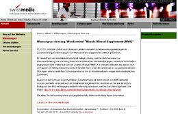 | − | Die Schweizer ''Swissmedic'' (Schweizerisches Heilmittelinstitut) warnte am 13. Oktober 2010 in einer Mitteilung "Warnung vor dem sog. Wundermittel "Miracle Mineral Supplements (MMS)" vor MMS. Laut Swissmedic sei es ''in diversen Ländern vermehrt zu Nebenwirkungsmeldungen im Zusammenhang mit dem Konsum von "Miracle Mineral Supplements (MMS)" gekommen.'' Nach oraler Einnahme kam es laut Swissmedic zu ''gastrointestinalen Störungen unterschiedlichen Schweregrades bis hin zu Hospitalisationen wegen lebensbedrohlichen Zuständen''.<ref>http://www.swissmedic.ch/aktuell/00003/01409/index.html?lang=de</ref> Die Swissmedic beruft sich auch auf einer Warnung vor MMS durch das Schweizer Bundesamt für Gesundheit (BAG) vom 8.10.2010.<ref>http://www.bag.admin.ch/themen/lebensmittel/04861/11249/index.html?lang=de</ref> | + | Die Schweizer ''Swissmedic'' (Schweizerisches Heilmittelinstitut) warnte am 13. Oktober 2010 in einer Mitteilung "Warnung vor dem sog. Wundermittel "Miracle Mineral Supplements (MMS)" vor MMS. Laut Swissmedic sei es ''in diversen Ländern vermehrt zu Nebenwirkungsmeldungen im Zusammenhang mit dem Konsum von "Miracle Mineral Supplements (MMS)" gekommen.'' Nach oraler Einnahme kam es laut Swissmedic zu ''gastrointestinalen Störungen unterschiedlichen Schweregrades bis hin zu Hospitalisationen wegen lebensbedrohlichen Zuständen''.<ref>http://www.swissmedic.ch/aktuell/00003/01409/index.html?lang=de</ref> Die Swissmedic beruft sich auch auf einer Warnung vor MMS durch das Schweizer "Bundesamt für Gesundheit" (BAG) vom 8.10.2010. Demnach hätte das "Schweizerische Toxikologische Informationszentrum" (STIZ) diverse Meldungen über gesundheitliche Störungen nach der Einnahme von MMS erhalten.<ref>http://www.bag.admin.ch/themen/lebensmittel/04861/11249/index.html?lang=de</ref> |