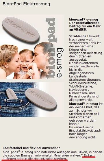 [[image:Bion-pad.jpg|Werbung für Scharlatanerieprodukt "bion-pad" der deutschen Firma bion-tec aus Radolfzell (Bild: bion-tec, September 2012)|360px|thumb]] | [[image:Bion-pad.jpg|Werbung für Scharlatanerieprodukt "bion-pad" der deutschen Firma bion-tec aus Radolfzell (Bild: bion-tec, September 2012)|360px|thumb]] | ||