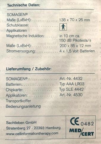 Über das Somagen-Gerät sind nur wenige Details in Erfahrung zu bringen. Es wird mit Batterien betrieben und besteht aus einem Gehäuse mit wenigen Bedienungselementen und angeschlossenen "Applikatoren", bei denen es sich vermutlich um flache Spulen handelt. Die Applikatoren sollen auf die zu behandelnden Körperstellen gelegt oder dort mit Verbandsmaterial befestigt werden. Die Anwendung wird mit "Chipkarten" gesteuert, die in das Gerät gesteckt werden. Eine Behandlung mit der Bezeichnung "Chronische Wunde" z.B. dauere 30 Minuten. Gefertigt wird das Gerät von der Firma Hiller Feinwerktechnik & Gerätebau GmbH in Neumünster.