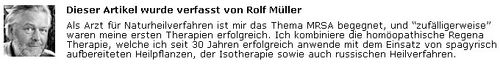 Rolf Müller macht in eigenen Beiträgen auf Internetwebseiten (darunter den Seiten des rechtsgericheten Projekts "Politaia" und bei Sein) und eigens angemeldeten privaten Webseiten[4] Angaben zu einer von ihm erfundenen "antibiotikalosen Therapie" von Infektionen durch die gefürchteten Methicillin-resistenten Stämme von Staphylococcus aureus (MRSA). In diesem Zusammenhang behauptet er drei MRSA-infizierte Patienten geheilt zu haben. Veröffentlichungen zu diesen behaupteten Heilerfolge sind allerdings weder von ihm noch von anderen Autoren nicht in wissenschaftlichen Publikazionen erschienen. Auch ist über eine etwaige Replikation durch andere Personen nichts bekannt. Vage Angaben zu einem Einzelfall veröffentlichte Müller in einem "Regenaplex-Rundbrief" der Firma Regena, die die homöopathisch verdünnten Regenaplex Heilmittel herstellt. In der kurzen Notiz "Fallbeispiel - Rezidivierende MRSA Furunkulosis antibiotikafrei ausgeheilt"[5] beschreibt Müller eine Regenaplex-Behandlung eines 40 jährigen MRSA-infizierten Mannes, der nach mehreren medizinischen Vorbehandlungen, einer TCM-Behandlung sowie einer versuchsmäßig durchgeführten Regenaplex-Behandlung MRSA-frei geworden sein soll. Behandelt wurde der Patient Mann mit Regenaplex Nr. 6, Nr. 23a, 26a, 26d, 48a, 50a, 62a und REGENAPLEX Haut-Fluid W (äußerliche Anwendung). Welches der Mittel und welche Therapie genau für die Heilung verantwortlich sein soll, wird aus dem ansonsten wissenschaftlich unveröffentlichten Artikel nicht deutlich, da es sich lediglich um eine ausgesuchte retrospektive Betrachtung handelt und nicht um eine kontrollierte, prospektive Studie. Zu homöopathisch potenzierten Arzneimitteln bislang kein wissenschaftlicher Nachweis für etwaige antibiotische Eigenschaften vor. Indirekt wird im Regena Rundbrief der Eindruck erweckt, dass die verwendeten homöopathischen Mittel ursächlich für die Heilung verantwortlich seien. Müller weckt jedoch selbst erhebliche Zweifel daran, da er in anderen Internetveröffentlichungen die von ihm behaupteten MRSA-Heilungen auch durch andere, pseudomedizinische und alternativmedizinische Behandlungen "zufällig" erzielt haben will. Dabei nennt er die Spagyrik und die Isopathie. Die von Müller bevorzugte Spagyrik scheint die Variante des 1879 geborenen Infanterieoffizier, Eisenbahntechniker, und selbsternannter Wunderheilers Carl Friedrich Zimpel zu sein. So schreibt Müller: