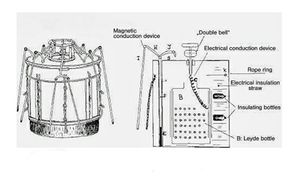 Schematischer Aufbau mit Magneten und Leydener Laschen zur Speicherung elektrischer Ladungen