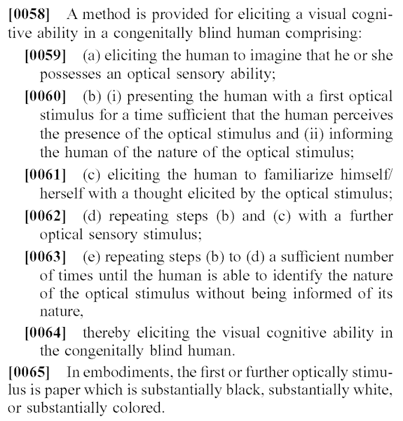 Das heißt, zunächst (a) müsse der Proband sich vorstellen, dass er sehen könne. Dann (b) wird ihm ein optischer Reiz präsentiert, z.B. ein farbiges Blatt Papier, und ihm die Art des Reizes mitgeteilt. Als Nächstes (c) müsse der Proband sich mit einem Gedanken vertraut machen, der durch den optischen Reiz ausgelöst wurde. Danach (d) werden die Schritte (b) und (c) mit einem anderen optischen Reiz durchgeführt. Schließlich (e) werden die Schritte (b) bis (d) so lange wiederholt, bis der Proband einen optischen Reiz erkennen könne, ohne dass ihm gleichzeitig mitgeteilt wird, um was für einen Reiz es sich handelt.