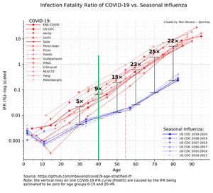 Hinweis: mit " Mortalitätsrate bei U-80, nicht vorerkrankten Corona-infizierten Patienten" meint der Autor offenbar die IFR des neuen Coronavirus CoV-2. Siehe Grafik mit Vergleich IFR der Grippe über alle Altersgruppen.