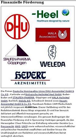 - Arzneimittelhersteller finanzieren einen Journalisten, der die Kritiker ihrer Produkte anschwärzt - bei jedem herkömmlichen Pharmakonzern wäre dies ein Skandal [...] Fritzsches Sponsoren sind die bekanntesten Hersteller homöopathischer Kügelchen. Marktführer ist die DHU, eine Tochterfirma des Arzneimittelherstellers Schwabe (Kytta, Prostagutt, Tebonin).. [...] Es geht nicht um kleine Summen: Der Gesamtumsatz aller Hersteller beträgt 400 Millionen Euro, 100 Millionen davon entfallen allein auf die DHU. Über den Gewinn schweigt sich die Firma aus. Fritzsche selbst sieht kein Problem im Sponsoring: "Mit allen Sponsoren bestehen nahezu identische Verträge", teilt er auf Anfrage mit, "die mich zur Einhaltung relevanter Gesetze sowie weltanschaulicher, wissenschaftlicher und politischer Neutralität verpflichten und darüber hinaus die Unabhängigkeit von Redaktion und wissenschaftlichem Beirat vertraglich absichern." Auch Werbung für die Produkte sei ausgeschlossen.