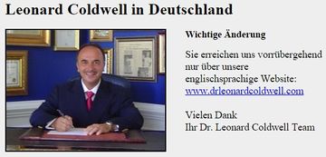 "Basierend auf einen alten Hitler Gesetzdarf ein Ausländer seinen rechtmässigen Dr Tutel in Deutschland nicht fuhren. Bedingt durch den Fakt das Leonard Coldwell keine Nostrifikation in Deutschland beantragt hat und in Deutschland auch nicht als Doctortätig ist fuhrt er diese Titel und Würden nicht in Deutschand. Alle referrenzen auf seine Dr Titel sind dashalb nur in den USAgültig und er fuhrt diese Titel auch nur in den USA. Darauf wie Ihn andere nennen und anreden hat Dr Coldwell keinen Enfluss. DearSpitzname Dr C ist ein eingetragenesWahrenzeichen und rechtlich alsTMgeschützt und kann nicht als litelffihrung gewertet werden, zumal wir hier klar darauf hinweisen das Dr Leonard Coldwell, NC, USA, seine in den USA rechtmässigen Tutel und Anerkennungen nicht in Deutschland fuhrt. Dr C ist ein MotivationsTrainer und Selbst Hilfe Coach und arbeited seit vielen Jahren nicht mehr persönlich mit Patienten. [...] Dr Coldwell (Dr Cwie Ihn seine Freunde nennen) ist nach Meinung aller massgeblichen Gesundheitsexperten, die wettweit führende Autorilät für Natürliche Heilmethoden, sowie der erfolgreichste Motivatins und Selbsthilfe Coach. Dr C ist der Best Selling Autorvon 21 Büchern. Dr C ist ein NMD ( Doctor of Naturopathic Medicine )vergleichbar mit Arzt für Naturheilkunde, mit officiellen Abschlüssen und Anerkennungen von North Carolina und anderen Staaten der USA. Siehe die original Urkunden auf der Biographie Seite. Dr C hat ebenfallseine Ehrendoktor Würde von der Louisiana Baptist Universität ffir seine Verdienste ffir die Menschheit erhalten. Nostrifizierung seiner Titel und Würden ist nicht beantragt. Dr C arbeitet seit vielen Jahren nicht mehr mit Patienten und hat sich ganz seinerAutoren und Seminartätigkeit gewidmet."[11]