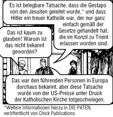 Chicks antikatholische Verschwörungstheorien befassen sich insbesondere mit einer angeblichen Verantwortlichkeit des Vatikans für den Holocaust. So behauptete er, Hitler sei durch das Reichskonkordat vom Vatikan berechtigt worden, die Inquisition weiterzuführen. Tatsächlich regelt das Reichskonkordat aber nur die Rechte der katholischen Kirche in Deutschland gegenüber dem deutschen Staat, wie etwa das Recht, dass die Kirche selbst entscheidet, wen sie in kirchliche Dienste einstellt. Es lassen sich keine Hinweise auf die Inquisition finden. Weiterhin wird der katholischen Kirche unterstellt, sie schleuse mit Hilfe der US-Einwanderungsbehörde massenhaft Katholiken in die USA, um das Land katholisch zu machen und die Verfassung zu untergraben. Es wird stets darauf hingewiesen, dass die US-Medien katholisch kontrolliert seien. Besonders interessant wird es, wenn Chick betont, dass es beim Verfassungskonvent 1787 im Interesse der protestantischen Verfassungsväter gewesen sei, die Freiheiten der Bürger zu sichern. Dass dies allerdings nur für erwachsene weiße Männer mit einem gewissen Besitz galt und nicht für Besitzlose, Frauen, Schwarze, Indianer und andere nicht privilegierte Personen, tut wohl nichts zur Sache.