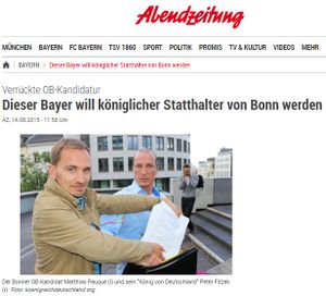 Am 13.09.2015 haben Sie es in der Hand und wirklich eine Wahl! Es ist Zeit für einen Neuanfang. JETZT! - ↑ Artikel "Verrückte OB-Kandidatur - Dieser Bayer will königlicher Statthalter von Bonn werden", AZ, 14.08.2015