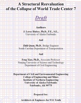 - ↑ J. Leroy Hulsey, Zhili Quan, Feng Xiao: A Structural Reevaluation of the Collapse of World Trade Center 7. Draft. University of Alaska Fairbanks, September 2019. (INE Report 18.17.)