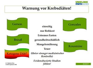 - Für alle Krebsdiäten liegen Daten über nachweislich hohe Risiken und Nebenwirkungen, wie Mangelerscheinungen von Makro - / Mikronährstoffen oder protrahierter Gewichtsabnahme vor. In keiner der offiziell Krebsdiäten propagierenden Internetpräsentationen finden sich ausreichende Darstellungen der nachweislichen und bekannten Risiken und Nebenwirkungen![11]
