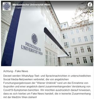 - In einer Sprachnachricht, die anonym im Sinne eines Kettenbriefs über WhatsApp verbreitet wird, behauptet eine unbekannte Frau (Elisabeth, die Mama vom Poldi), die Einnahme des Schmerz- und Fiebermittels Ibuprofen sei Schuld an den schweren Verläufen und der hohen Sterblichkeit durch die vom Coronavirus SARS-CoV-2 ausgelöste Lungenerkrankung Covid-19 in Italien. Als inoffizielle Quelle wird die Uniklinik Wien genannt. Diese distanziert sich bei twitter von den Behauptungen und spricht eindeutig von Fake News: "Wir möchten ausdrücklich darauf hinweisen, dass es sich hierbei um Fake News handelt, die in keinerlei Zusammenhang mit der MedUni Wien stehen!"[10][11] Ein Artikel in der renommierten "The lancet" geht nur hypothetisch auf eine mögliche erhöhte Viruslast ein, die durch eine Hochregulation von ACE2 Rezeptoren auf Zielzellen des Virus verursacht werden könne. Ursache dafür seien Mittel wie ACE Hemmer, Ibuprofen und Sartane. Andererseits sind blutdrucksenkende ACE-Hemmer in der Diskussion als Kandidaten für Wirkstoffe die das CoV-19 hemmen könnten.[12] Ausführlich geht auch die Wochenzeitschrift Der Spiegel auf dieses Thema ein: Artikel: Coronavirus - steigt das Infektionsrisiko durch Ibuprofen, Der Spiegel, 17. März 2020 Das arznei-telegramm ordnet den ganzen Vorgang fachlich ein: Belastbare wissenschaftliche Belege für einen spezifischen negativen Effekt von Ibuprofen auf Infektionsrisiko und Krankheitsverlauf von COVID-19 gibt es derzeit nicht. Es gibt aber gute Gründe, bei schweren Atemwegsinfektionen und bei der in ihrem Verlauf noch wenig bekannten COVID-19-Infektion auf nichtsteroidale Antirheumatika (NSAR) zu verzichten und – falls eine Fiebersenkung überhaupt geboten ist – Parazetamol vorzuziehen.[13]