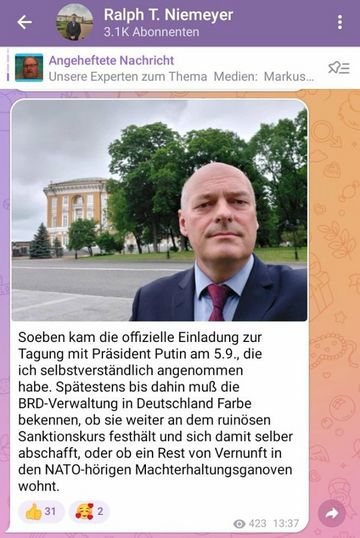 Ralph Niemeyer ist mehrfach Gast beim Youtube-Kanal „DruschbaFM“ der Putin-Unterstützer Sergej Filbert und Alina Lipp gewesen. Dort verbreitet er unter anderem die Reichsbürger-Erzählung, Deutschland hätte seit dem Zweiten Weltkrieg keine gültige Verfassung und einen Friedensvertrag mit den ehemaligen Kriegsparteien gebe es nicht.
