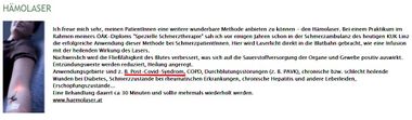 ..Die Hämolaser-Therapie ist eine ganzheitsmedizinische Regulationstherapie. ... Alle Angaben über Eigenschaften, Wirkungen und Indikationen beruhen auf den Erkenntnissen und Erfahrungen innerhalb der Therapiemethoden selbst..[1]