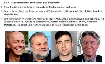 Freihochdrei sollte als "Kronjuwel" täglich eine Art alternative Tagesschau senden, bei der bekannte Vertreter der Trutherszene und der rechten Szene auftreten sollten. Genannt wurden der Identitäre Martin Sellner sowie Gerhard Wisnewski, Oliver Janich und Manfred Petritsch als „große Besetzung“. Die rechtsextremen "Identitären" werden vom Verfassungsschutz beobachtet und sollen etwa 500 Mitglieder in 100 Ortsgruppen haben. Ihnen werden im Zeitraum zwischen April 2017 und August 2018 laut Innenministerium der Bundesrepublik Deutschland 114 Straftaten zugeordnet.