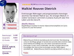 Öffentlich verlautbarte Wahrsager Dietrich eine "vererbte übersinnliche Begabung" zu haben: Malkiel Rouven Dietrich (Lestat) wurde die Kunst der Sterndeutung schon in die Wiege gelegt. Er besitzt eine vererbte übersinnliche Gabe. Seine Familie beschäftigt sich seit sieben Generationen mit der Astrologie.