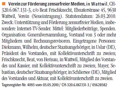 - ↑ Verein zur Förderung zensurfreier Medien, in Wattwil, CH-320.6.067.131-3, c/o Beat Frischknecht, Ebnaterstrasse 45, 9630 Wattwil, Verein. Statutendatum: 26.03.2010.