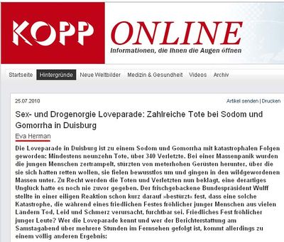 Bei der "Loveparade" 2010 in Duisburg kamen 19 Menschen durch einen Massenandrang und Stürze beim Zugang zum Veranstaltungsgelände ums Leben. Obwohl die Ursache des Unglücks noch endgültig zu klären sein wird, sind organisatorische Fehler und Fehlentscheidungen der Veranstalter und Behörden wahrscheinlich. Ganz anders sieht das Eva Herman. In einem Beitrag beim Kopp-Verlag am Folgetag des Unglücks (25.7.2010) malte Herman ein apokalyptisches Horrorszenario von einer "Sex- und Drogenorgie Loveparade" von "wildgewordenen Massen" bei "Sodom und Gomorrha in Duisburg" an die Wand. Der Stadt Duisburg und dem Bundesland NRW unterstellte sie Wahrheit eine riesige Drogen-, Alkohol- und Sexorgie, geplant, genehmigt und zum Teil finanziert zu haben. Schuld sieht sie dabei auch bei der 68‘er Bewegung, die wegbereitend dafür gewesen sein soll. "Eventuell" hätten aber auch nicht näher genannte "andere Mächte mit eingegriffen", um einem "schamlosen Treiben endlich ein Ende zu setzen", wie sie sich ausdrückte. Laut Herman sei die Veranstaltung in Wahrheit eine riesige Drogen-, Alkohol- und Sexorgie, geplant, genehmigt und zum Teil finanziert von der Stadt Duisburg und NRW. Bereits vor dem Ereignis seien viele der Besucher "wie ferngesteuert" gewesen, bevor sie "mit glasigen Blicken" sich wie in Trance und dünn bekleidet oder sogar nackt bewegt hätten. Herman: Viele Mädchen haben den Busen blank gezogen, manche sind fast völlig nackt. Sie wiegen sich in ekstatischer Verzückung im ohrenbetäubenden Lärm, Begriffe wie Sittlichkeit oder Anstand haben sich in den abgrundtiefen Bassschlägen ins Nichts aufgelöst...Riesige dunkle Wolken der Enthemmung und Entfesselung treiben über dem Geschehen, die jungen Menschen wirken, als hätten sie jegliche Selbstkontrolle abgegeben, ekstatisch und wie im Sog folgen sie dem finsteren Meister der sichtbaren Verführung. Ursache für dieses Verhalten sei ein "kultureller und geistiger Absturz einer ganzen Gesellschaft". Ursache für den Verfall sei wohl die 68'er Bewegung gewesen: Die unheilvollen Auswüchse der Jetztzeit sind, bei Licht betrachtet, vor allem das Ergebnis der Achtundsechziger, die die Gesellschaft »befreit« haben von allen Zwängen und Regeln, welche das »Individuum doch nur einengen«. Wer sich betrunken und mit Drogen vollgedröhnt die Kleider vom Leib reißt, wer die letzten Anstandsrnormen feiernd und tanzend einstürzen lässt, und wer dafür auch noch von den Trägern der Gesellschaft unterstützt wird, der ist nicht weit vom Abgrund entfernt. Die Achtundsechziger haben ganze Arbeit geleistet!