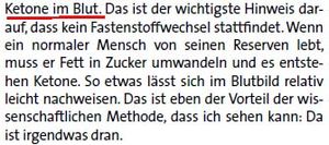 - 2003 ist er zumindest zehn Tage lang unter Videoüberwachung untersucht worden. Für diesen Zeitraum können die Ärzte garantieren, dass er nichts gegessen und nichts getrunken hat und auch nicht auf die Toilette gegangen ist. Wenn das ein normaler Mensch macht, überlebt er das durchaus auch, wenn er in gesunder Kondition ist, aber er muss zumindest seinen Harn loswerden. Wenn er das nicht macht, hat er extrem erhöhte Harnwerte und er wird sich selbst vergiften. Dieser Yogi aber hatte ganz normale Harnwerte, er hatte normale Blutzuckerwerte und er hatte keine Ketone im Blut. Das ist der wichtigste Hinweis darauf, dass kein Fastenstoffwechsel stattfindet. Wenn ein normaler Mensch von seinen Reserven lebt, muss er Fett in Zucker umwandeln und es entstehen Ketone. So etwas lässt sich im Blutbild relativ leicht nachweisen. Das ist eben der Vorteil der wissenschaftlichen Methode, dass ich sehen kann: Da ist irgendwas dran.