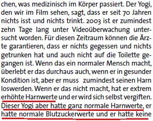 Aber genau das Gegenteil davon trat ein, wenn man sich die vom Untersucher Shah berichteten Blutwerte ansieht. Diese sind von Shah selbst im Internet auf seiner privaten Webseite veröffentlicht worden, zusammen mit Röntgen-, MRT- und Ultrallschallbildern (Link zu den Werten, wie sie von Sudhir Shah berichtet werden). Interessant ist hier, dass der Verlauf des einfach zu messenden Körpergewichts während der Untersuchung verheimlicht wird. Auch ist zu erkennen, dass ein sehr auffälliger Blutzucker-Messwert, der auf eine Nahrungsaufnahme kurz vor Ende des Experiments hinweist, nachträglich wieder gelöscht wurde.