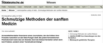 - ↑ Jens Lubbadeh: "Homöopathie-Lobby im Netz - Schmutzige Methoden der sanften Medizin", Süddeutsche Zeitung, 30.06.2012