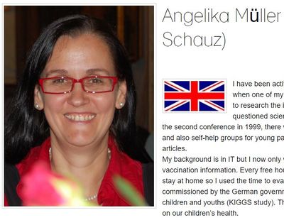 Angelika Müller (jusqu'en 2012 Angelika Kögel-Schauz) est une opposante à la vaccination d'Augsburg et préside une association appelée "Interessengemeinschaft EFI - Eltern für Impfaufklärung" (l'acronyme EFI signifie "Parents pour des éclaircissements sur la vaccination")[1] qui a également un site web à l'avenant (www.efi-online.de). Une autre activiste d'EFI est Sieglinde Kaufmann de Dresde, présidente de "Eltern für Impfaufklärung" (EFI) de Dresde. Müller, avec Sonja Houzer, est active dans l'association Impfaufklärung e. V. Des critiques reprochent leurs erreurs et fraudes flagrantes dans leurs rapports et pamphlets. Müller est en outre administrateur de la page de Facebook "Deutschland verbrennt den Impfpass" (l'Allemagne brûle le carnet de vaccination). Le domaine internet correspondant a été enregistré par Müller début juillet 2014.