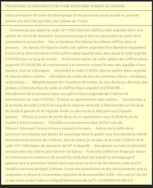 - Article dans le wikipedia russe concernant Грабовой,_Григорий_Петрович, c'est à dire Grabovoï, Grigoriy Petrovich. Utiliser un traducteur…