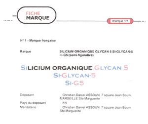 Cette nouvelle découverte est si enthousiasmante que le « professeur » s'empresse d'en déposer le nom le 10 octobre 2006 (numéro de demande : 3457452) sous trois variantes différentes : Silicium organique Glycan 5, Si-Glycan-5 et Si-G5. et le même indigo: "Ne vous laissez surtout pas avoir, il s'agit d'une MAGOUILLE du LABORATOIRE GLYCANPHARMA du Sieur ASSOUN, il s'agit d'une véritable escroquerie ! c'est un scandale !"